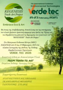 Για άλλη μια χρονιά το Εικαστικό Περιβαλλοντικό πρόγραμμα «REGENESIS» με τους εικαστικούς του έχει την τιμή να συμμετέχει στην Διεθνή Έκθεση Περιβαλλοντικών Τεχνολογιών VERDE.TEC 2025 υπό την διοργάνωση της T Press.