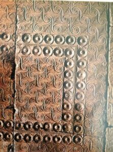 Οι τοίχοι εσωτερικά είχαν επένδυση από λεπτές πρασινωπές τετράγωνες πλάκες σκαλισμένες με ανθέμια, ρόδακες, και σπειροειδή κοσμήματα (στη δεξιά φωτογραφία ).