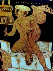 Στον Απουλικό κρατήρα, 370 πΧ (Μιλάνο Συλλογή Τorno), o Nεοπτόλεμος κυνηγημένος κάθεται πάνω στο βωμό όπου θα τον σκοτώσει σε λίγο ο Ορέστης.