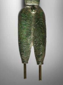 Ο τονισμός επιτείνεται με την αύλακα της σπονδυλικής στήλης βαθιά χαραγμένης στο μέταλλο. Τα ορθάνοιχτα μάτια του ήταν ένθετα από πολύτιμες ύλες, μη σωζόμενα.