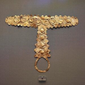 Από θαλαμοειδή τάφο του περιβόλου Α του Μηκηναϊκού ανακτόρου, ανευρέθη επίχρυσο χάλκινο έλασμα (Inv. No 8559), διακοσμημένο με σπείρες repousse του (17-16 ου π.Χ. αιώνα), αποκαλούμενη συμβατικά «ταινία του γονάτου», γιατί η πλειονότης αυτού του τύπου των κτερισμάτων, εντοπίστηκε κοντά στα λείψανα των γονάτων των νεκρών πολεμιστών της Μυκηναϊκής εποχής.