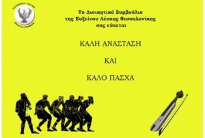 Το Τοπικό Συμβούλιο και τα Μέλη του Παραρτήματος Σαλαμίνος της Ένωσης Αποστράτων Αξιωματικών Στρατού (ΕΑΑΣ) σας εύχονται η Ανάσταση του Κυρίου να φέρει ένα καλύτερο κόσμο και ελπίδα στις ψυχές των ανθρώπων.