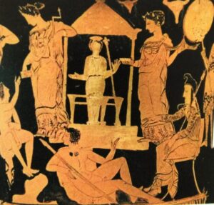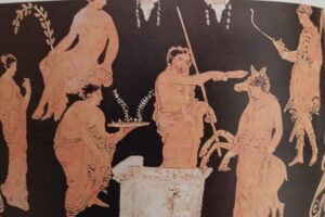 Μπροστά στο βωμό στέκει ο ιερέας με το μαχαίρι στο χέρι. Απέναντί του η Ιφιγενεια και από πάνω της η Άρτεμις που έχει βάλει δίπλα στην κόρη ένα ελάφι για τη θυσία…….