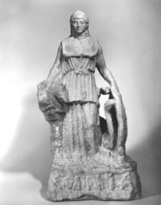 Το αγαλματίδιο σε Πεντελικό μάρμαρο (φωτό) με ύψος (41 εκ.), βρέθηκε στον αρχαιολογικό χώρο της Πνύκας Αθηνών το έτος 1859.