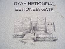 Ηετιώνεια Πύλη αποτελούσε μεγάλο οχυρωματικό έργο στην εποχή του, χωρίς ιδιαίτερη αυλή, που όμως δέσποζε του αρχαίου λιμένα, αριστερά του εισερχομένου, λόγω ακριβώς του βραχώδους υψώματος που είχε ανεγερθεί. Έφερε δίφυλλη θύρα πλάτους 3,70 μ, ανάμεσα σε δύο πύργους διαμέτρου περίπου 10 μ.