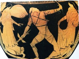 Αριστερά είναι μια Νίκη που τρέχει να φύγει, ενώ δεξιά η κόρη του Τηρώ που τραβιέται μακριά του. (Ινστιτούτο Τέχνης Σικάγο ).