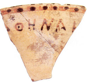 Το ότι ο ναός ήταν αφιερωμένος στην Αθηνά αποδεικνύεται από το είδος των αναθημάτων, αλλά κυρίως από ενεπίγραφο όστρακο χιακής κύλικας , με το όνομα της θεάς, που χρονολογείται στο β΄ τέταρτο του 6ου αι. π.Χ.