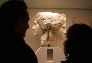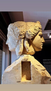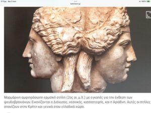 Παραλλαγή αμφιπρόσωπης Ερμαϊκής Στήλης με την πανέμορφη κεφαλή της Αριάδνης και του κισσοστεφή Διονύσου, ήρθε στο φώς κατά τις ανασκαφές στην αρχαία Ελευθέρνα, και φυλάσσεται στο τοπικό Αρχαιολογικό Μουσείο. Είναι μαρμάρινη του (2 ου μ. Χ.) με εγκοπές για την έκθεση των ψευδοβραχιόνων, το δε εύρημα σπανίζει στην Κρήτη και εν γένει στον Ελλαδικό χώρο.