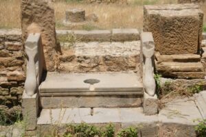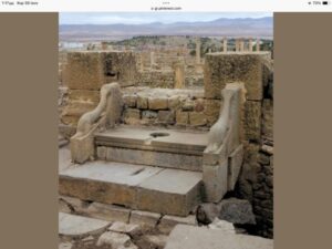 3. Αρχαία δημόσια Ρωμαϊκή τουαλέτα στα ερείπια της Τimgad της Αλγερίας της εποχής του Διοκλητιανού, με δύο σκαλιστά δελφίνια στους βραχίονες του …ευρύχωρου καθίσματος, που μπορούσε να συμπεριλάβει και από έναν …παχύσαρκο!