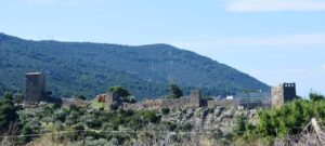 Αριστερά μου ο βορειοανατολικός πύργος, γκρεμισμένος αλλά αναστυλώνεται όπως μαρτυρούν οι σκαλωσιές (και η απαγόρευση προσέγγισης στον χώρο) και δεξιά μου ο ανακατασκευασμένος Νοτιοανατολικός πύργος που ήδη ανέφερα.