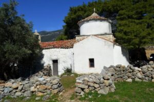Έχοντας κάνει τον κύκλο του πύργου, ξεμακραίνω προς το εκκλησάκι του Αη Γιώργη. Μπαίνω μέσα και όλοι οι ήχοι σταματούν. Ηρεμία… Γαλήνη! Όλα όσα ένα ταπεινό εκκλησάκι μπορεί να προσφέρει σε έναν οδοιπόρο, ότι κι αν πιστεύει. Οι τοιχογραφίες με κοιτάνε ανάμεσα στα σημάδια του χρόνου. Έντονα τα χρώματα παρ όλα αυτά! Ο θόλος και οι οροφή των μικρών πτερύγων του ναού σχεδόν ολοκληρωτικά κατεστραμμένα. Φωτιά ;;; Υγρασία;; Ποιος να ξέρει… Δεν φεύγεις πάντως εύκολα από την γαλήνη του ναΐσκου. Το φως όμως με καλεί μέσω της μικρής πόρτας και βγαίνω πάλι έξω . Οι φωνές και οι ψαλμουδιές που εικονογράφησα στο μυαλό μου έχουν πια σβήσει και τώρα κυριαρχούν τα κελαηδίσματα των πουλιών (και τα χάχανα των Στιγμών, για να μην ξεχνιόμαστε !).