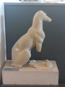 Το μαρμάρινο κυνηγετικό σκυλί των μέσων του (4 ου π.Χ.) αιώνα βρέθηκε στην Ανατολική περιοχή του νεκροταφείου της Πέλλας, και έκτοτε κοσμεί το Νέο Αρχαιολογικό Μουσείο της Πέλλας στην Μακεδονία.