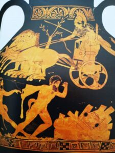 Στην πρώτη εικόνα Ερυθρόμορφη πελίκη 440- 430 π.Χ Βρετανικό Μουσείο. Ο Ηρακλής έχει βγάλει τη λεοντή και απλώνει το χέρι να πάρει από τη Δηιάνειρα τον δηλητηριασμένο χιτώνα .