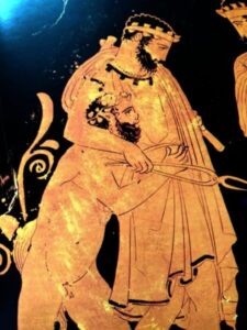 Ο Διόνυσος τον μέθυσε και με τη βοήθεια ενός Σάτυρου, πηγαίνουν τώρα στον Όλυμπο – Ερυθρόμορφη πελίκη 435-430 πΧ .