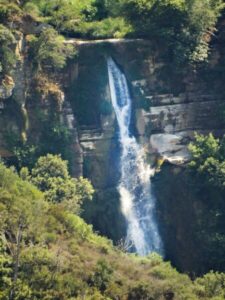 Από μια στροφή του δρόμου αυτού θα πάρουμε το μονοπάτι που κατευθύνεται στον πάτο της βαθιάς λάκας που σχηματίζουν οι πτυχώσεις των δύο πρανών. Στο τέρμα της οδοιπορίας αυτής θα έχουμε φτάσει κάτω από έναν καταπληκτικό καταρράκτη, ύψους τριάντα και παραπάνω μέτρων που διακινεί τεράστιες ποσότητες νερού, ακόμη και στα μέσα του Ιούνη.