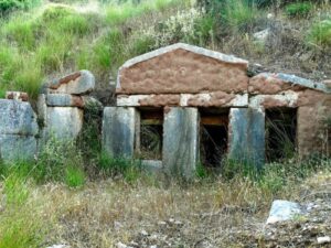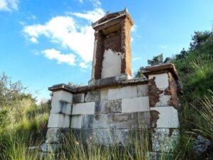 Η απόσταση του ενός από τον άλλο ναό είναι περίπου πεντακόσια μέτρα. Όμως ανατολικότερα και αρκετά πιο μακριά από το ναό, στην τσιγκογραφία του σχεδιαγράμματος, απεικονίζεται φωτογραφικά ένα πανέμορφο ταφικό μνημείο με αέτωμα που χάνεται στα βάθη της πλαγιάς. Αγωνίζομαι να το βρω, αλλά ο χρόνος που με παίρνει είναι πολύς και το αποτέλεσμα απογοητευτικό.
