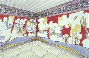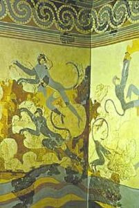 Κάτω από στρώμα τέφρας και ελαφρόπετρας που κάλυψε τον οικισμό η καταστροφική έκρηξη του Ηφαιστείου της Σαντορίνης , η οποία ήταν πέντε φορές ισχυρότερη από την έκρηξη του ηφαιστείου Κρακατόα στον Ειρηνικό ωκεανό, ήρθε στο φώς η τοιχογραφία (φωτό) με ύψος (2,70 μ.) και πλάτος (2,76 μ.) της ώριμης Υστεροκυκλαδικής I περιόδου.