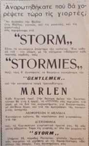 Μετα τον ΟΡΦΕΑ οπου η δημοτικοτητα των STORMIES εκτοξευτηκε στα υψη… Απο την δισκογραφικη τους και παλι »ριχνεται» η ιδεα δημιουργιας ενος κλαμπ που θα »μαζευε» ολους τους φιλους καινουριους και παλιους σε ενα »δικο» τους χωρο. Χαρακτηριστικη ειναι η καταχωρηση στους ΜΟΝΤΕΡΝΟΥΣ ΡΥΘΜΟΥΣ της αναγγελιας-προσκλησης για τις γιορτες του 65 και την δημιουργια του »STORM» To CLUB ηταν στη οδο ΛΗΜΝΟΥ παροδο της ΠΑΤΗΣΙΩΝ στην πλατεια ΑΜΕΡΙΚΗΣ .Ο ΝΙΚΟΣ ΜΑΣΤΟΡΑΚΗΣ για να ενισχυσει περισσοτερο το »STORM» ανεφερε οτι στον ιδιο χωρο θα ηχογραφουσε δυο προσφερομενες εκπομπες της MUSIC BOX στο κρατικο ραδιοφωνο. ΤΟ…ΙΣΤΟΡΙΚΟ »ΛΕΩΦΟΡΕΙΟΝ Η ΜΕΛΩΔΙΑ» και η συνεχως ανερχομενη εκπομπη »ΔΙΣΚΟΜΑΝΙΑ » Κατα τ αλλα την ΖΩΗ ΚΟΥΡΟΥΚΛΗ που ειχε διαφορετικους επαγγελαμτικους προσανατολισμους αντικατεστησε στο »STORM» η νεαρη ΜΑΡΛΕΝ . Δευτερο συγκροτημα που»ξεκουραζε» τους STORMIES ηταν οι GENTLEMEN .. Toυς αναφερουμε γιατι απο εκει ξεκινησε ο ντραμερ ΛΟΥΚΑΣ ΣΙΔΕΡΑΣ που σε ορισμενες περιπτωσεις αντικαθιστουσε τον ΜΑΚΗ ΣΑΛΙΑΡΗ και αφου περασε απο ΜΙΝΙS καΙ WE FIVE εγινε μαζι με ΠΑΠΑΘΑΝΑΣΙΟΥ ΡΟΥΣΟ το τριτο μελος των APHRODITE’S CHILD .