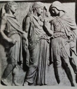 Στη μέση, μαρμάρινο ανάγλυφο που παρουσιάζει τον Ορφέα με την Ευρυδίκη και αριστερά τον Ερμή ψυχοπομπό. Αντιγραφο 1ου αι. μΧ. από πρωτότυπο του 4ου π.Χ . Νεάπολη, Εθνικό Αρχαιολογικό Μουσείο.