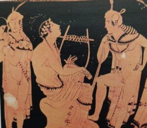 Στη δεύτερη εικόνα επάνω, από έναν ερυθρόμορφο κρατήρα του 450 π.Χ , ο Ορφέας παίζει την λύρα του και ημερεύει τους άγριους Θράκες πολεμιστές. Κρατικό Μουσείο Βερολίνου.