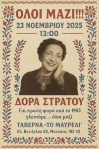 Στο αντάμωμα μνήμης, συγκίνησης, μεγαλείου, δόξας και τιμής στη Δόρα Στράτου και το έργο της, 23.11.2025, μεγαλούργησαν άπαντες, με τελετάρχη την Ελένη Σπαθιά και έλαβαν το λόγο και ιστόρησαν οι: Κασσιανή Δικαιολάκου, Κώστας Τσιάνος, Γιώργος Μαυρόπουλος. Χόρεψε πολλές φορές ο όρκος: Πάντα ανταμώματα!