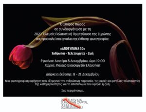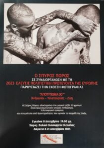 Μια ξεχωριστή εικαστική πρόταση υποδέχεται η Ελευσίνα τον Δεκέμβριο, καθώς ο διεθνούς φήμης και κύρους φωτογράφος Σπύρος Πώρος παρουσιάζει στο Παλαιό Ελαιουργείο την επετειακή του έκθεση «Αποτύπωμα 30» αφιερωμένη στα τριάντα χρόνια της καλλιτεχνικής του καριέρας.
