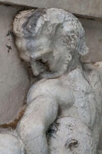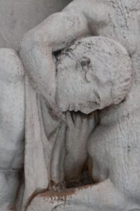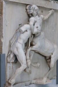 Ένας Κένταυρος στο ανάγλυφο σφίγγει τον λαιμό ενός Λαπίθη, και ετοιμάζεται να του καταφέρει ένα γερό χτύπημα με το κλαρί που κρατά στο δεξί του χέρι.