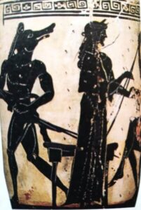 Παρουσιάζει την Κίρκη να ανακατεύει το μαγικό ποτό της για να το δώσει στον Οδυσσεα. Ένας από τους συντρόφους του φεύγει μεταμορφωμένος σε ζώο. – Εθνικό Αρχαιολογικό Μουσείο Αθήνας