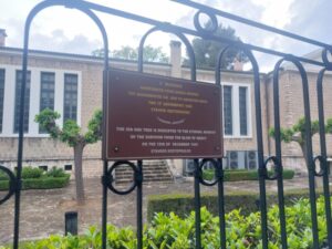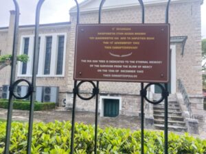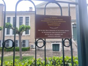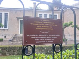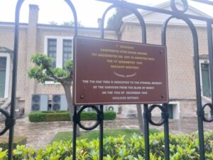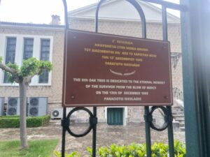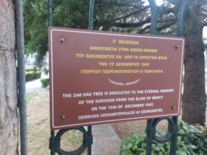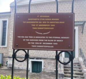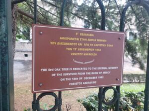 Ακριβως απεναντι απο τις 13ις βελανιδιες  εχουν τοποθετηθεί 13ις ταμπελίτσες ,  καλαίσθητες , δίγλωσσες , διπλής όψεως,  στην Ελληνική και Αγγλική γλώσσα,  που αναφέρει κάθε μία χωριστά το όνομα καθενός εκ των  13 Διασωθέντων απο την χαριστική βολη των Γερμανων ..