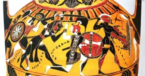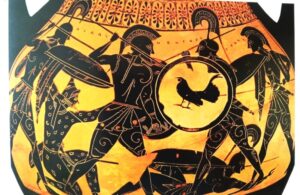Οι δύο γιοι του Τελαμώνα. Ο Αίας μονομαχεί με τον Έκτορα, και γονατισμένος δίπλα του ο αδελφός του Τεύκρος τεντώνει το τόξο του κατά των αντιπάλων. Μελανόμορφος αμφορέας 510 -500 . Μόναχο, Staatliche Antikensammlungen .
