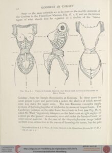 Το μικρογλυπτό διαθέτει προκλητική και προχωρημένη εμφάνιση, καθώς φοράει στενό κορσέ (corset) με πλαϊνά ελάσματα που ανυψώνουν το γυμνό και ελεύθερο στήθος της, (όπως οι σύγχρονες μπανέλες στους στηθόδεσμους-σουτιέν), και φέρει ένα ιδιαίτερο κάτω ενδυμα που ανυψώνει τους γυμνούς γλουτούς, ενώ καλύπτει την πρόσθια γεννητική περιοχή, σαν ζώμα σε σχήμα «σπασουάρ» , όπως εκείνο που φορούσαν οι α ν δ ρ ε ς αθλητές στις παραστάσεις με τα Ταυροκαθάψια!