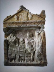 Το εν λόγω επιτύμβιο ανάγλυφο (φωτό) αποκαλύφθηκε κοντά στα ιαματικά Λουτρά της Αιδηψού (Θερμαι Σύλλα) που μας περιγράφει ο Μενέλαος Λουντέμης στο «Καληνύχτα Ζωή, 1946», στην τοποθεσία ΗΡΑΚΛΕΙΟΝ, κοντά στις πηγές των Αγίων Αναργύρων.