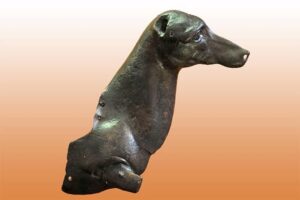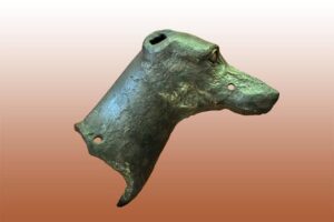 Οι δ ύ ο χ ά λ κ ι ν ο ι σ κ ύ λ ο ι φιλοτεχνημένοι τον (4 ο π. Χ. αιώνα) που εκτίθενται στις προθήκες του Αρχαιολογικού Μουσείου Δελφών, είναι αριστουργήματα της τορευτικής τέχνης των κλασικών χρόνων.