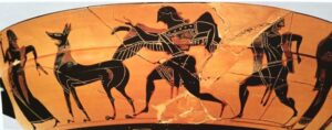 Στην εικόνα, ο Πανδάρεος τρέχει να γλιτώσει από τον Ερμή που τον κυνηγάει. Ο χρυσός σκύλος στέκεται ακίνητος και γαυγίζει. Μελανόμορφη κύλικα γύρω στο 560 π.Χ , Λουβρο