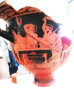Ένας δούλος έβαζε στα τραπεζάκια που είχαν μπροστά τους το φαγητό και μια κύλικα (ποτήρι κρασιού) και τη γέμιζε με » οίνον άκρατον» κρασί ανέρωτο.