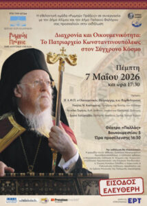 Το Πατριαρχείο Κωνσταντινουπόλεως στον Σύγχρονο Κόσμο» την Πέμπτη, 7 Μαΐου 2026 και ώρα 17:30 (έναρξη προσελεύσεως ώρα 16:30 – πέρας προσελεύσεως ώρα 17:15).
